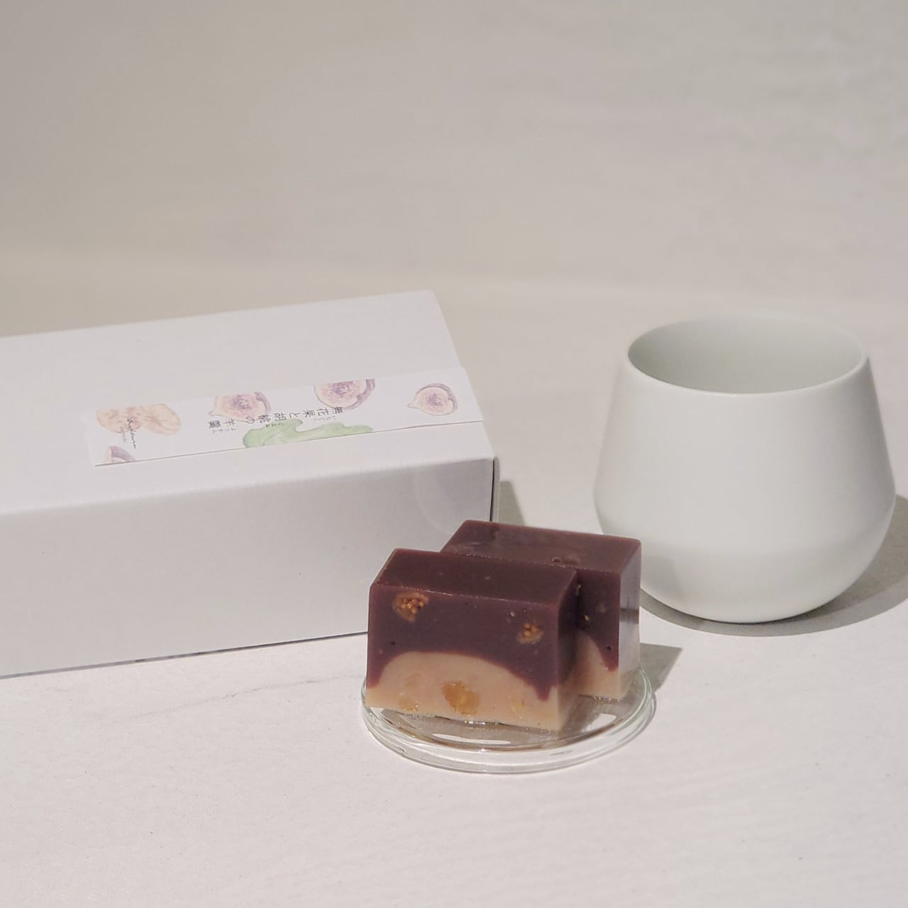無花果の繊細な粒感を加えた黒糖羊羹と、胡桃の軽やかな食感と香ばしさが重なる胡桃羊羹。白餡と黒餡の二層仕立ての羊羹に仕上げました。
