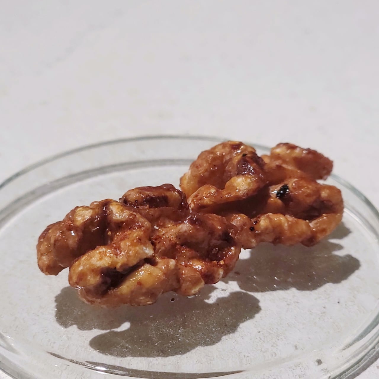 胡桃のかりっとした食感に、醤油の香ばしさとカラメルのような甘さを重ねました。甘じょっぱさが心地よく、柚子七味の爽やかな辛みが上品に香ります。茶や酒のお供に。