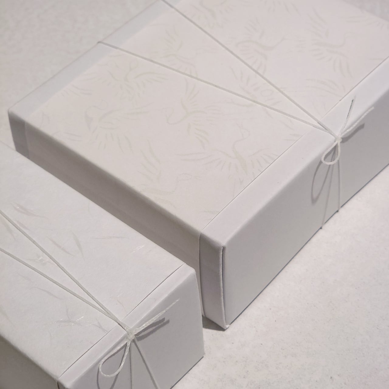 白色ではなく、赤色の蝋引き紐と折り鶴、そして花束のイラスト付きの専用用紙を添えて、お届けいたします。